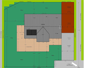 Hier ein erster Entwurf, wie wir die einzelnen Komponenten auf dem Grundstück ausrichten wollen. Die Proporzionen stimmen hier leider nicht genau, wenn man die Bemaßungen betrachtet. In diesem Versuch wollten wir lediglich einmal sehen, wie wir die Einfahrt, das Carport und die Terrasse planen könnten, und wieviel Grünfläche anhand der Bemaßung dann noch bleibt. Die Einfahrt soll auf jeden Fall 4,00 Meter breit werden.
