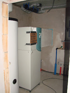...am Montag wurde ich nach der Arbeit am Haus vom Trockenbauer überrascht, da der Montagewagen von "INTRO-BAU" vor dem Haus stand. Allerdings war nur ein Monteur im Haus. Er hatte aber bereits alle Rigipsplatten 1 x gespachtelt und damit angefangen, die restlichen Aussparungen für die Lüftungskanäle im Bad und im Flur, wo die Luft ja "abgesaugt" wird, mit Rigipsplatten zu schließen.